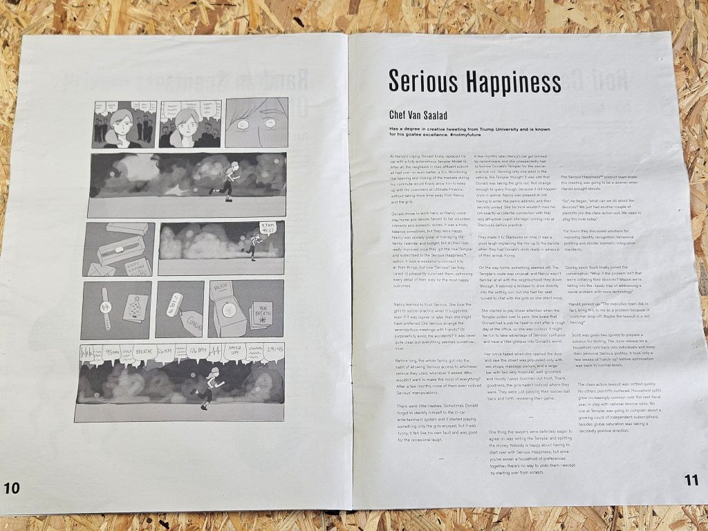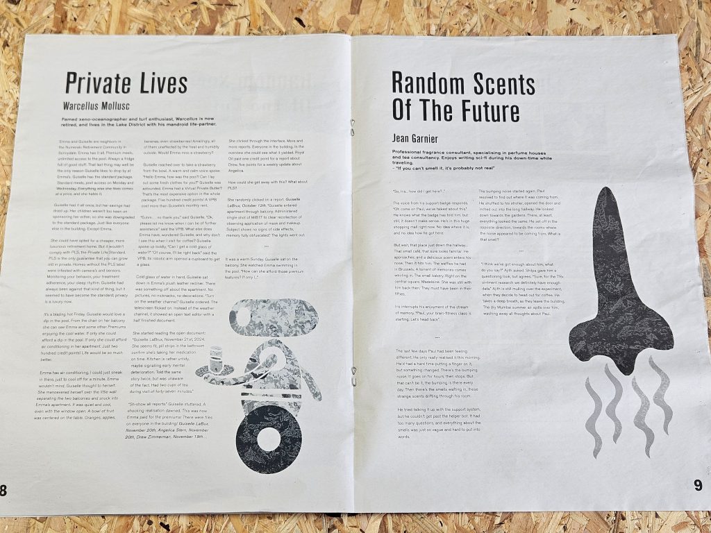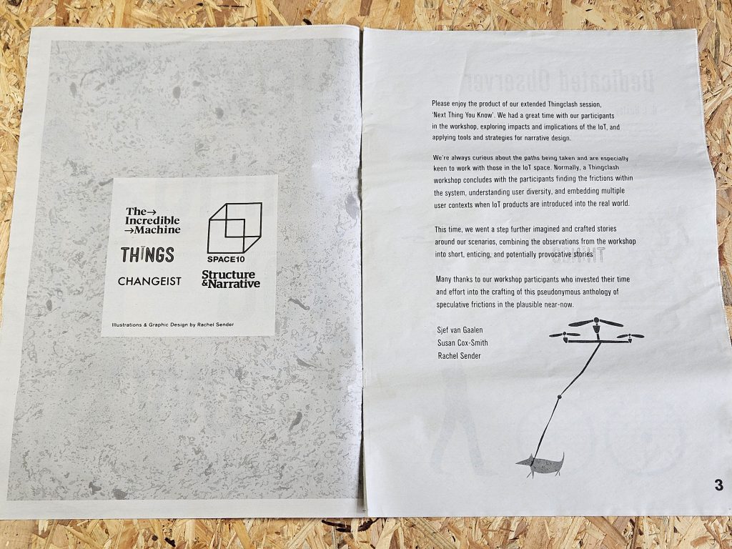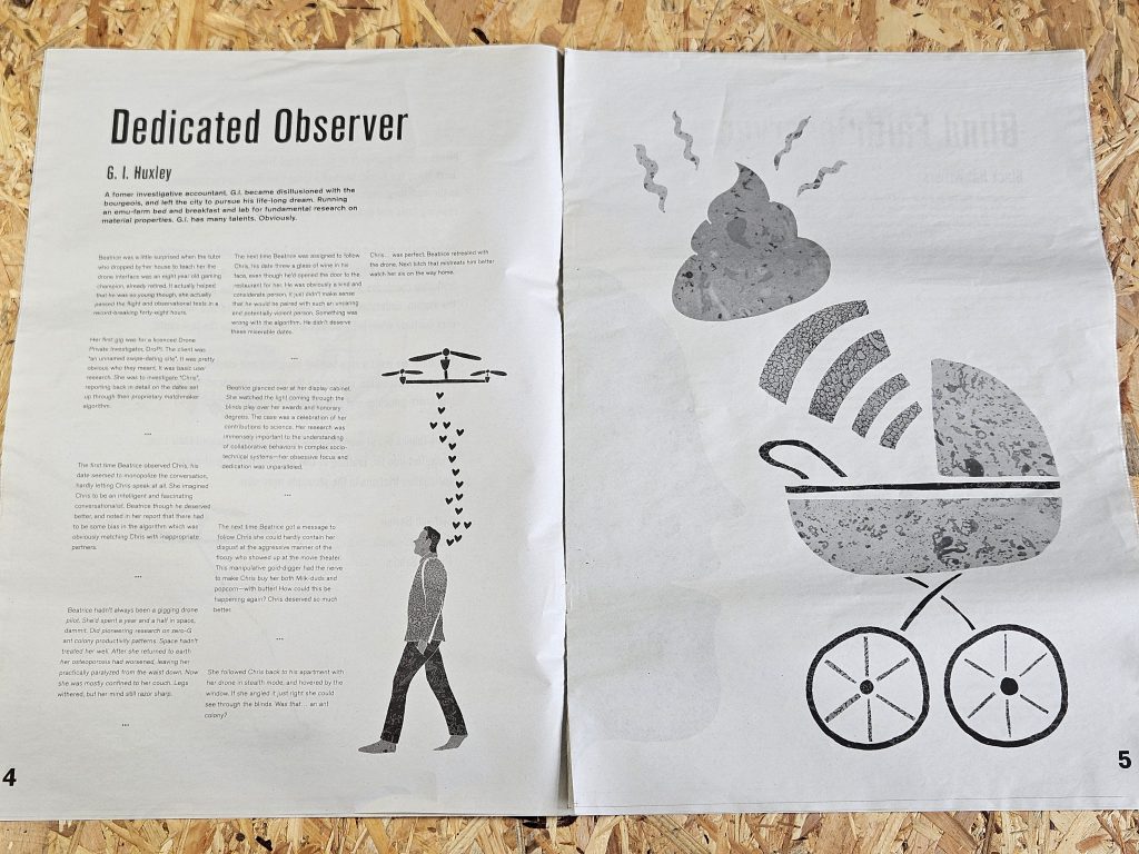 Dubbed “Speculative Frictions in the Plausible Near-now”, the stories were drafted during a writing workshop on the first day of the conference, edited overnight, and distributed in newspaper format at the conference the next day.